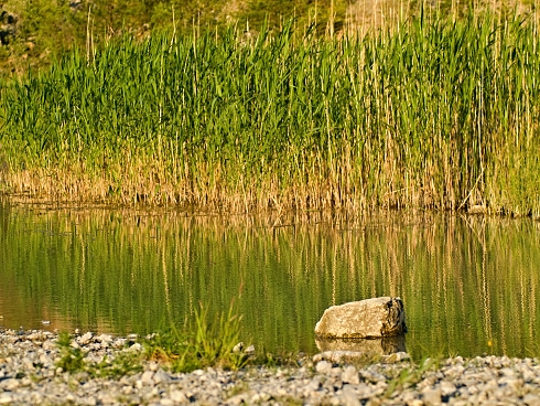 Z tŕstia ma nedôverčivo pozoroval káčer a kúsok od neho sa do vody vnorila úžovka.