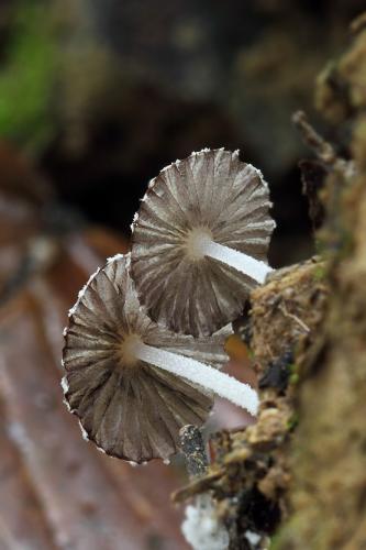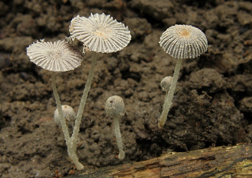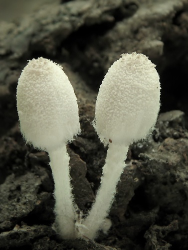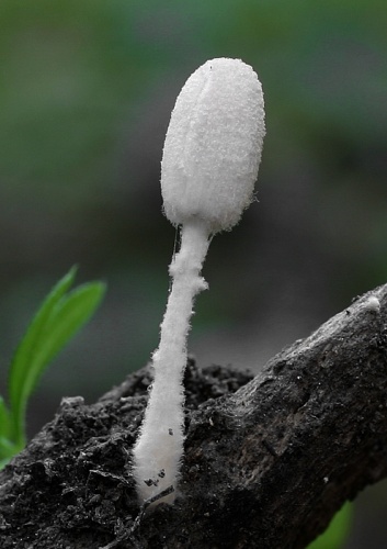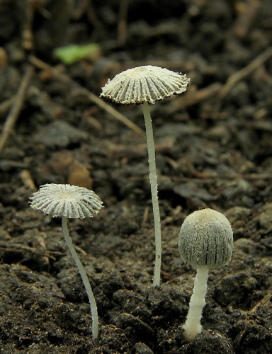 Klobúk je v mladosti až 7x5 mm veľký, v dospelosti až 12 mm široký, vajcovitý, neskôr kužeľovitý až napokon plochý, na sivom podklade pokrytý belavým až krémovým práškovitým velom, ktoré je v strede klobúka až okrové a čoskoro mizne, takže presvitá sivá farba. Je výrazne radiálne ryhovaný.