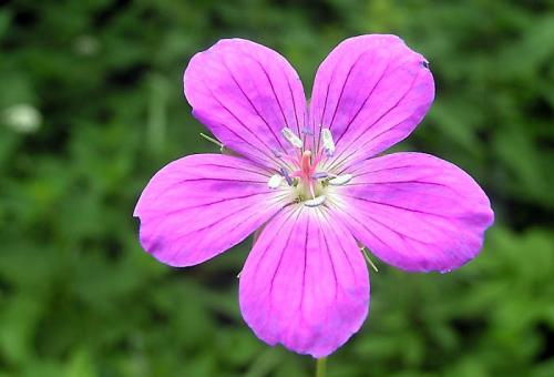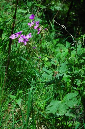 Opis: Trváca bylina vysoká 30-50 cm. Byľ vzpriamená, hranatá, krátko chlpatá, v hornej časti rozvetvená a žliazkatá. Listy dlaňovito 3-7 dielne s nepravidelne hrubo zubatým okrajom, prízemné dlho stopkaté, byľové sediace. Kvety v bohatých vidliciach na vzpriamených žliazkatých stopkách. Kališné lístky 3-5 žilové, korunné lupienky červenofialové s tmavšími žilkami. Zobákovitý plod sa po dozretí rozpadáva na 5 jednosemenných dielov.