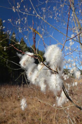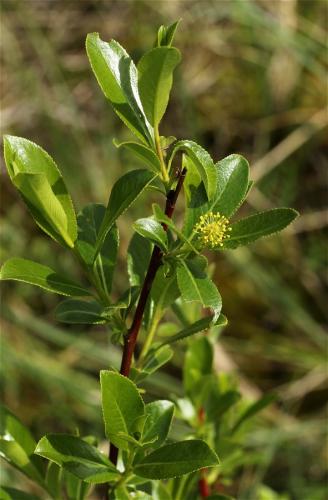 Drevina, konáriky má červenohnedé, listy vajcovito elipsovité, pilkovité, ostro končisté, celkom holé, dospelé sú kožovité, na líci lesklé, na rube matné. Jahňady 5 cm, valcovité.