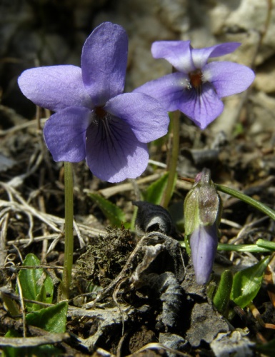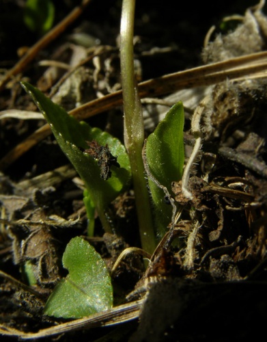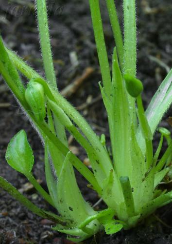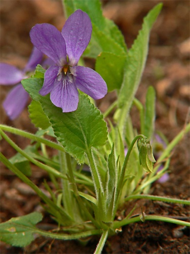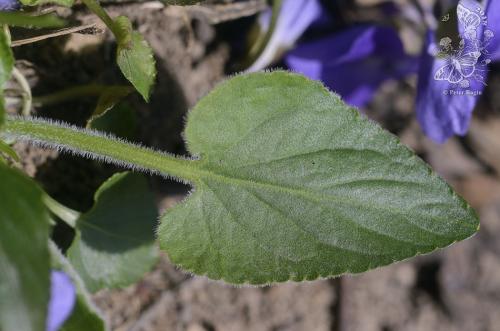 Opis: Trváca, na jar drobná, do 5 cm vysoká v lete až do 30 cm vysoká bylina. Podzemok 2 - 6 mm hrubý, listy dlhostopkaté, stopka husto, kratučko chlpatá, čepeľ podlhovasto trojuholníkovitá, 1,5 - 2 x dlhšia než široká, na báze srdcovitá, plytko vrúbkovane pílkovitá. Palisty kopijovité, celookrajové, často brvité. Kvetné stopky lysé, listene pod ½ stopky, kvety v priemere okolo 15 mm, nevoňavé. Kališné lístky podlhovasté, tupé, 5 - 6 mm dlhé. Korunné lístky obrátene vajcovité, ostroha 13 - 18 mm dlhá, zakrivená. Plodom sú chlpaté tobolky.