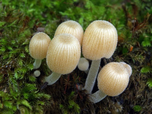 Klobúk je 4-12 mm široký, na primordiách má guľovitý tvar, v mladosti polguľovitý, kužeľovitý až zvoncovitý, v dospelosti klenutý, v starobe plochý, v štádiu dozrievania výtrusov začína vystupovať nízky hrboľ v strede s priemerom 1-4 mm, od hrboľa až po okraj radiálne ryhovaný, s celistvým, neroztrhaným okrajom, farba v primordiálnom štádiu od vystupujúcich pileocystíd belavá až sivastobelavá, prekrývajúca bledookrovú farbu podkladu, v mladosti sú pileocystidy menej husto usporiadané a zvýrazňuje sa farba podkladu, ktorá je v dospelosti žltookrová, okrová až sivookrová, starnutím od okraja k stredu do siva. Stred býva v mladosti tmavší, sivookrový až hnedookrový, no vstarobe zostáva najbledší - sivookrový až špinavo sivookrový oproti popolavosivo sfarbenému okraju, povrch je hlavne v mladosti pod lupou jemne chĺpkatý od pileocystíd, suchý. V starobe sa okraj stáča smerom nadol.